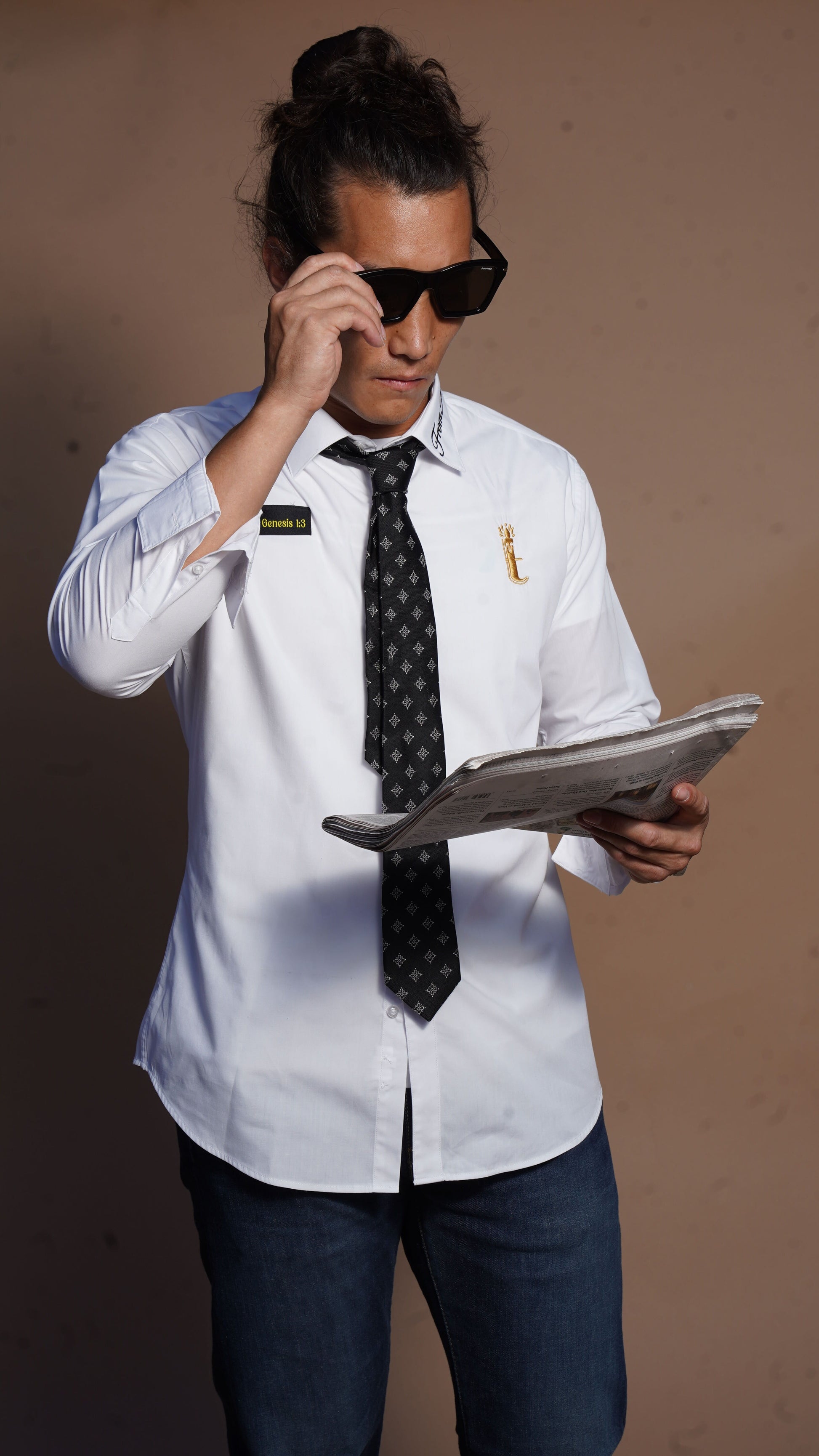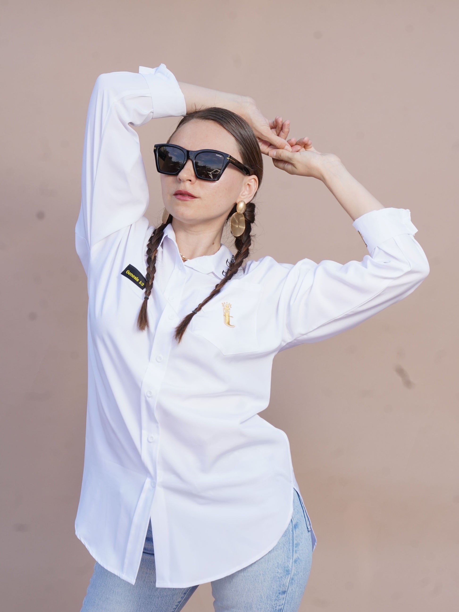 This is a clean white shirt with long sleeves and buttons. It has cool gold designs: